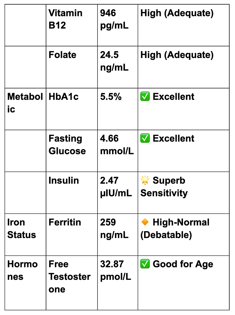 Insulin Sensitivity: Your insulin of 2.47 is elite. You are metabolically younger than your chronological age. This protects you from neurodegeneration and cancer.